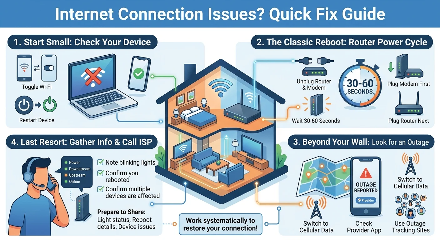You can also check outage tracking websites. If hundreds of people in your zip code are complaining about the exact same provider, you just have to wait it out. Calling support during a massive outage usually just results in sitting on hold for an hour.